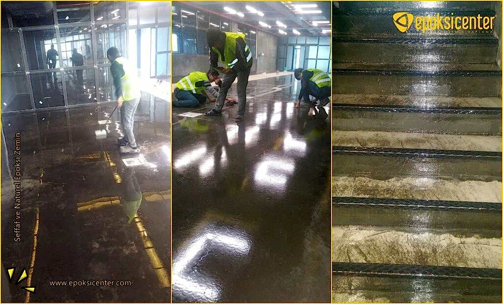 Şeffaf epoksi uygulaması biraz daha zahmetlidir. Kesinlikle zeminde kir ya da farklı renkte bir uygulama olmamalıdır. Zeminde tüm hatalar olduğu gibi zemine yansıyacaktır. Uygulama öncesi zemin komple temizlenir, tozu alınır ve kirpi rulolar ile uygulanır. Şeffaf epoksi kaplama kesinlikle uzman ekip tarafından yapılmalıdır. Emprenye epoksi uygulaması ise kimi zaman uzman ekip de gerektirmez, duvar boyaması yapabilen herkes tarafından rahatlıkla yapılabilir.